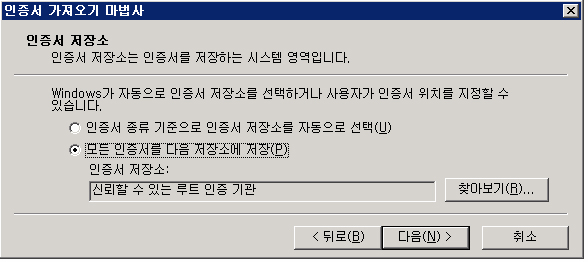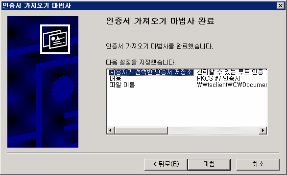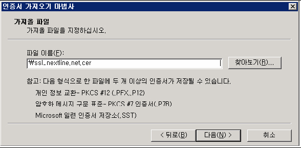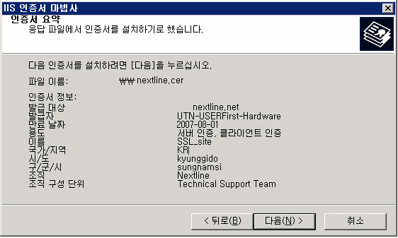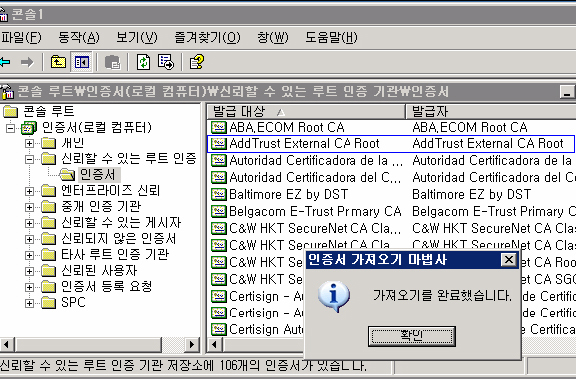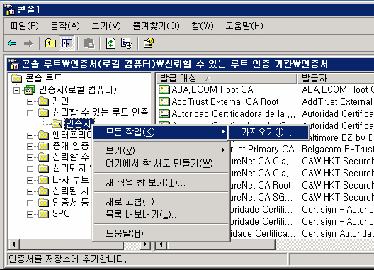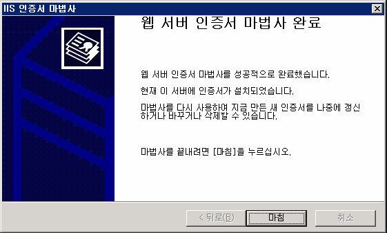 | [Window] 1. ÀÎÁõ ±â°ü¿¡¼ ȸ½Å ¹ÞÀº ÆÄÀÏ (µµ¸ÞÀÎ.crt)À» ¼¹ö¿¡ º¹»ç ÇÕ´Ï´Ù. 2. ½ÃÀÛ -> ÇÁ·Î±×·¥ -> °ü¸®µµ±¸ -> ÀÎÅÍ³Ý ¼ºñ½º °ü¸®ÀÚ -> À¥»çÀÌÆ® -> µî·ÏÁ¤º¸ ![]() 3. 'µð·ºÅ丮 º¸¾È'¿¡ '¼¹ö ÀÎÁõ¼'¸¦ ¼±ÅÃÇÏ¿© 'À¥ ¼¹ö ÀÎÁõ¼ ¸¶¹ý»ç'¸¦ ½ÃÀÛÇÕ´Ï´Ù. ![]() 4. 'À¥ ¼¹ö ÀÎÁõ¼ ¸¶¹ý»ç'¸¦ ½ÃÀÛÇÕ´Ï´Ù. ![]() 5. º¸·ù ÁßÀÎ ¿äû ó¸®-¸ÞÀÏÀ» ÅëÇÏ¿© ¹ÞÀº ÀÎÁõ¼(-----begin ºÎÅÍ end------±îÁö)¸¦ ÀúÀåÇÑ ÆÄÀÏÀ» ¼±ÅÃÇÕ´Ï´Ù. ÀÎÁõ¼ ÆÄÀÏÀ» ¼±ÅÃÇÑ ÈÄ ´ÙÀ½ ¹öưÀ» ´©¸¨´Ï´Ù. ![]() ÀÌ¹Ì ÀÎÁõ¼°¡ ¼³Ä¡µÈ ¼¹ö¿¡¼´Â ´ÙÀ½°ú °°Àº ¸Þ¼¼Áö°¡ ³ªÅ¸³³´Ï´Ù. (óÀ½ ¼³Ä¡ ¼¹ö Á¦¿Ü) ![]() 6. '´ë±â ÁßÀÎ ¿äû ó¸®'¿¡ ÀÎÁõ ±â°ü¿¡¼ ¹ß±ÞµÈ ÆÄÀÏÀÇ °æ·Î¸¦ ÁöÁ¤ÇÏ¿© ÆÄÀÏÀ» ºÒ·¯¿É´Ï´Ù. 7. 'SSL Æ÷Æ®' ¸¦ ÁöÁ¤ ÇÕ´Ï´Ù. ![]() 8. ÀÎÁõ¼¿¡ ´ëÇÑ »ó¼¼ Á¤º¸¸¦ È®ÀÎ ÇÒ ¼ö ÀÖ½À´Ï´Ù. ![]() 9. ÀÎÁõ¼ ¸¶¹ý»ç°¡ ¿Ï·á µÇ¾ú½À´Ï´Ù. ![]() 10. ÀÎÁõ¼ ¼³Ä¡ ÈÄÀÇ ¼³Á¤ ±âº» À¥ »çÀÌÆ®ÀÇ µî·ÏÁ¤º¸¿¡¼ À¥»çÀÌÆ® ÅÇÀ» ¼±ÅÃÇÕ´Ï´Ù. À¥ »çÀÌÆ® È®ÀÎ ¼½¼Ç¿¡¼ °í±Þ ¹öưÀ» Ŭ¸¯Çؼ SSL Æ÷Æ®¿¡ 443À» ¼³Á¤ÇØÁÝ´Ï´Ù. (±âº»ÀûÀ¸·Î 443À» »ç¿ëÇÏÁö¸¸, »çÀÌÆ® ¿î¿µÀÚ°¡ 1~65535 ¹üÀ§ ³»¿¡¼ ÀÓÀÇ·Î Æ÷Æ® ¹øÈ£¸¦ ¼³Á¤ÇÒ ¼ö ÀÖ½À´Ï´Ù.) 11. ÀÎÁõ¼ ¼³Ä¡ È®ÀÎ ÀÎÁõ¼°¡ Á¤È®È÷ ¼³Ä¡µÇ¾ú´ÂÁö ÀÎÁõ¼°¡ ¼³Ä¡µÈ ȨÆäÀÌÁö¸¦ ÅëÇØ È®ÀÎÇÒ ¼ö ÀÖ½À´Ï´Ù. https:// ÀÎÁõ¼ ½Åû URL¿¡ Á¢¼ÓÇØ¼ ÇÏ´Ü¿¡ ³ë¶õ ÀÚ¹°¼è ¹öưÀÌ ¶ß´ÂÁö È®ÀÎÇÕ´Ï´Ù. ¸¸ÀÏ 443ÀÌ ¾Æ´Ñ ´Ù¸¥ Æ÷Æ®·Î SSL Æ÷Æ®¸¦ Àû¿ëÇÏ¿´À» °æ¿ì¿¡´Â ÁÖ¼Òâ µÚ¿¡ Æ÷Æ®¹øÈ£¸¦ ÁöÁ¤ÇØ¾ß È®ÀÎ ÇÒ ¼ö ÀÖ½À´Ï´Ù. (¿¹ : https://sslsecurity.kr:443) ====================================================== [·çÆ® CA ÀÎÁõ¼ ¼³Ä¡] ÀÎÁõ¼ ¹ß±ÞÈÄ 30ÀÏ ÀÌÈÄ¿¡´Â Àç¹ß±ÞÀÌ µÇÁö ¾ÊÀ¸¹Ç·Î Àý´ë ÁÖÀǰ¡ ÇÊ¿äÇÕ´Ï´Ù. 1. ½ÃÀÛ --> ½ÇÇà --> mmc ¸¦ ÀÔ·Â ÈÄ È®ÀÎÀ» ¼±Åà ÇÕ´Ï´Ù. ![]() 2. 'ÄܼÖ' âÀÌ È°¼ºÈ µË´Ï´Ù. 'ÆÄÀÏ'¿¡¼ '½ºÅÇÀÎ Ãß°¡/Á¦°Å'¸¦ ¼±Åà ÇÕ´Ï´Ù. ![]() 3. 'ÄܼÖ'¿¡ '½º³ÀÀÎ Ãß°¡/Á¦°Å'¸¦ ¼±Åà ÇÕ´Ï´Ù. ![]() 4. 'µ¶¸³ ½ÇÇàÇü ½º³ÀÀÎ Ãß°¡'¿¡¼ 'ÀÎÁõ¼'¸¦ ¼±Åà ÈÄ 'Ãß°¡'¸¦ Ŭ¸¯ ÇÕ´Ï´Ù. ![]() 5. 'ÀÎÁõ¼ ½º³ÀÀÎ'¿¡¼ 'ÄÄÇ»ÅÍ °èÁ¤'À» ¼±Åà ÈÄ '´ÙÀ½'À» Ŭ¸¯ÇÕ´Ï´Ù. ![]() 6. 'ÀÎÁõ¼ ½º³ÀÀÎ'¿¡¼ 'ÄÄÇ»ÅÍ °èÁ¤'À» ¼±Åà ÈÄ '´ÙÀ½'À» Ŭ¸¯ÇÕ´Ï´Ù. ![]() 7. ÄܼÖÀÇ '½Å·ÚÇÒ ¼ö ÀÖ´Â ·çÆ® ÀÎÁõ ±â°ü' --> 'ÀÎÁõ¼'¿¡ ¿À¸¥ÂÊ ¸¶¿ì½º¸¦ Ŭ¸¯ÇÏ¿© '¸ðµç ÀÛ¾÷' -->'°¡Á®¿À±â'¸¦ Ŭ¸¯ÇÕ´Ï´Ù. ![]() 9. 'ÀÎÁõ¼ °¡Á®¿À±â ¸¶¹ý»ç'°¡ ½ÃÀÛ µË´Ï´Ù. ![]() 9. 'ã¾Æº¸±â'¸¦ Ŭ¸¯ÇÏ¿© ÀÎÁõ¼°¡ À§Ä¡ÇÑ °æ·Î¸¦ ÁöÁ¤ÇÕ´Ï´Ù. ![]() 10. '¸ðµç ÀÎÁõ¼¸¦ ´ÙÀ½ ÀúÀå¼Ò¿¡ ÀúÀå'À» üũÇϰí '´ÙÀ½'À» Ŭ¸¯ÇÕ´Ï´Ù. ![]() 11. 'ÀÎÁõ¼ °¡Á®¿À±â ¸¶¹ý»ç'¸¦ ¿Ï·á ÇÏ¿´½À´Ï´Ù. ![]() 12. '¿Ï·á' ¸Þ¼¼Áö ÀÔ´Ï´Ù. ![]() ·çÆ® ÀÎÁõ¼°¡ ¿Ï·áµÇ¸é 'AddTrust External CA Root'°¡ µî·ÏÀÌ µÇ¾ú½À´Ï´Ù. 13. ¸ðµç »çÇ×ÀÌ Àû¿ëµÈ ÈÄ IIS service¸¦ ´Ù½Ã ½ÃÀÛÇÕ´Ï´Ù. |